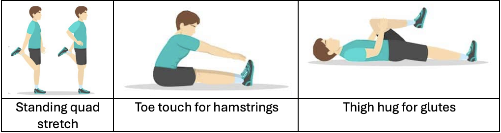 Warm up properly – prep the quads, glutes and hamstrings with light resistance repetitive movements with a Theraband.